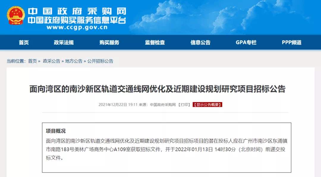 招标!南沙轨道交通线网及近期规划研究项目公告