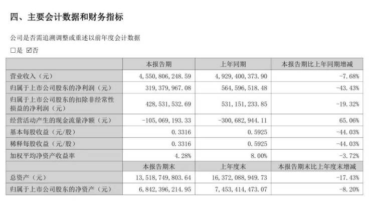 索菲亚上半年公司实现营业收入45.51亿元,同比下降7.68%;归属于上市公司股东的净利润3.19亿元,同比下降43.43%。