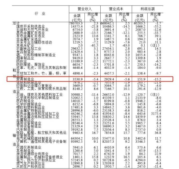 国家统计局8月27日发布2025年1-7月全国规模以上工业企业利润数据报告。数据显示,全国规模以上家具制造企业营业收入3530.9亿元,同比下降5.45%;营业成本2929.4亿元,同比下降5.6%;利润总额151.9亿元,同比下降15.2%。