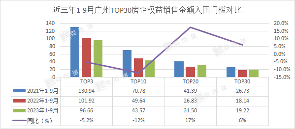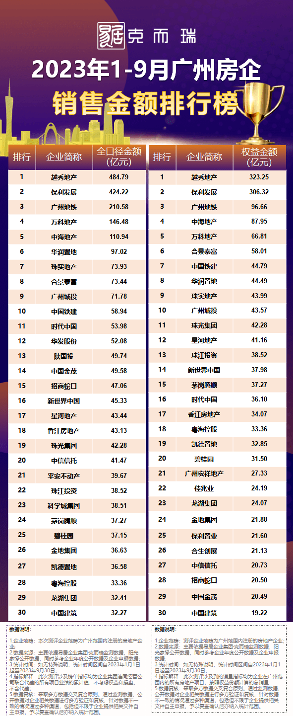 克而瑞发布《2023年1-9月广州房地产企业销售榜TOP30》,从全口径、权益、流量等多个维度分析,以客观全面地反映广州房企在前三季度的销售运营和综合开发实力。