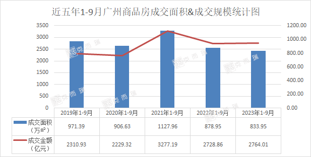 从成交规模来看,今年9月广州市商品房共成交833.95万㎡,同比减少5%,成交金额2764.01亿元,同比上升1.3%,成交规模为五年内第二高。