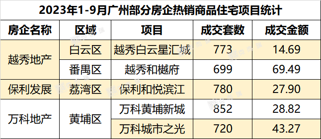 从流量金额排行榜TOP3房企的热销商品住宅项目来看,上榜的商品住宅项目今年1-9月的成交套数都在600套以上,越秀地产与万科地产分别有两个项目上榜,成交金额最高的是越秀和樾府,为69.49亿元。成交套数最高的是万科黄埔新城,共计822套。