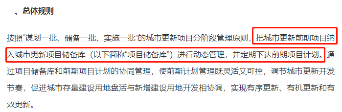 首先,“97号文”提出,把城市更新前期项目纳入城市更新项目储备库进行动态管理,并定期下达前期项目计划。
