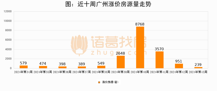 从调价房源来看,第43周广州涨价房源239套,较上周下降74.9%。与此同时,43周涨价房源占比提升2.39个百分点,业主信心持续恢复。