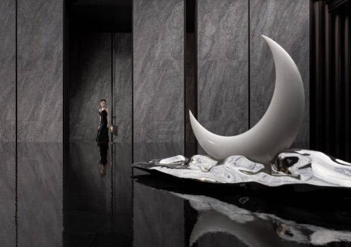 经连廊,还能看见200m²超奢水庭之上,从四川雅安独有的石材,跨越1600公里,价值超50万的大师定制级汉白玉玄月雕塑,并以约11米高玻璃盒子+金属格栅,与汉白玉玄月雕塑相呼应,打造“镜湖月影”画卷,呈现出“月影照青壁,扶树迎归人”的高奢气韵。