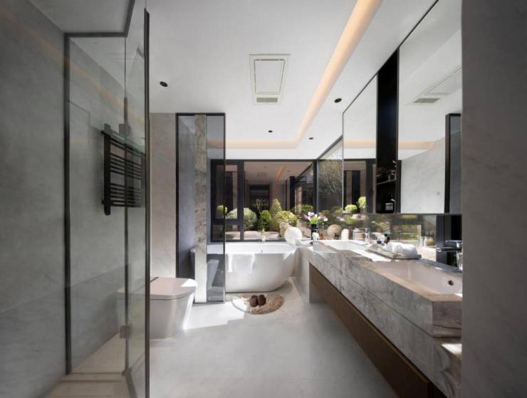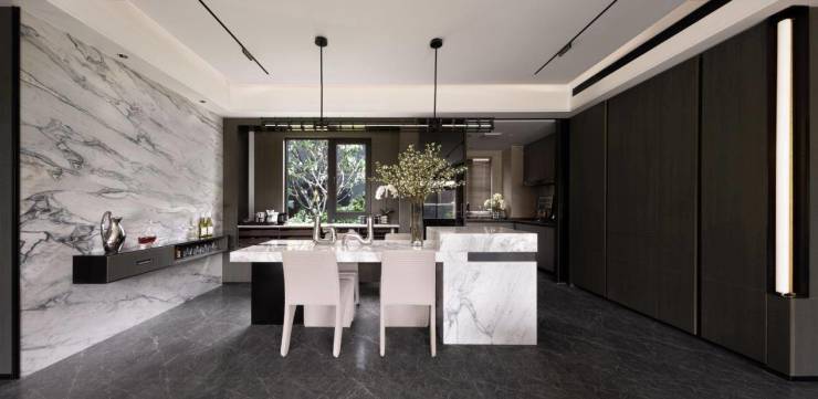 190㎡餐客厅大背景墙全部采用专属定制天然石材——“汝窑青花瓷”,地、墙砖造价达30多万。开放式大理石台面岛台,7大厨电交标——德国博世品牌厨电四件套、美国GE通用嵌入式大冰箱、美国滨特尔净水器、爱适易垃圾处理器。主卧卫浴配欧洲顶级智能化品牌—瑞士恩仕卫浴系统、全功能的智能马桶以及单价超3万的智能浴缸。