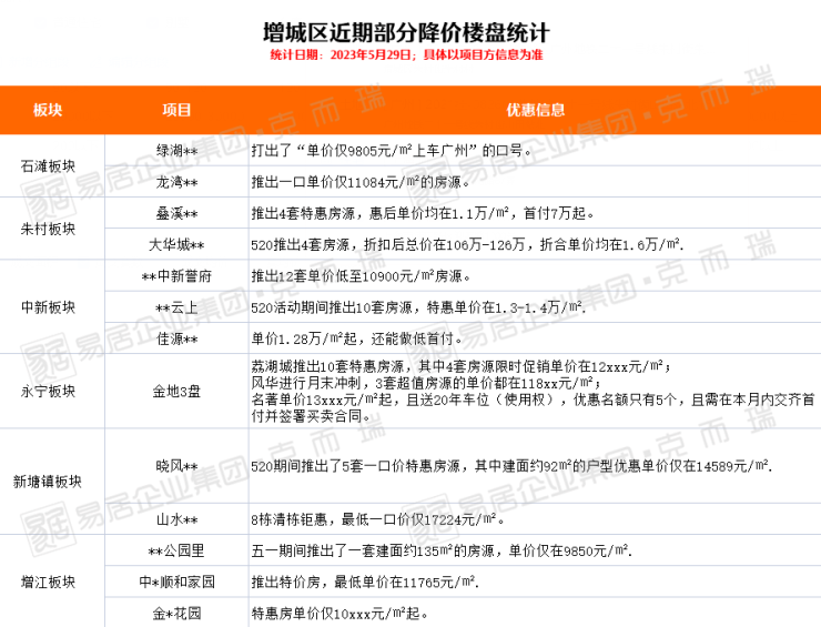以增城相对热门的新塘、永宁、朱村板块为例,均有楼盘推出特惠一口价。