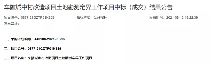 8月13日,车陂城中村改造项目土地勘测定界工作项目中标(成交)结果公布。