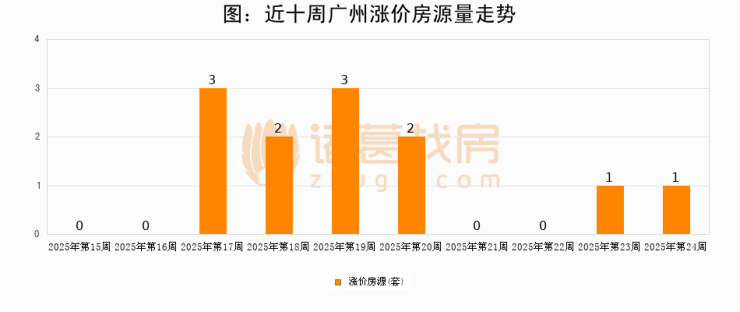 从调价房源来看,第24周广州涨价房源1套,较上周持平。与此同时,24周涨价房源占比回落0.58个百分点,业主信心小幅波动,购房者可则需入市。