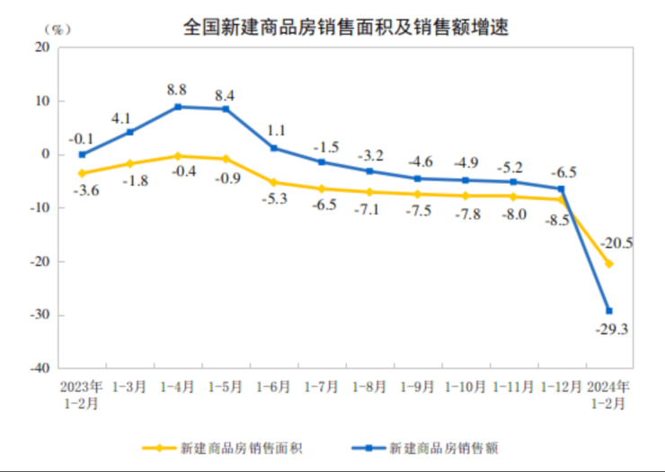 在新建商品房销售和待售方面,1—2月份,新建商品房销售面积11369万平方米,同比下降20.5%,其中住宅销售面积下降24.8%。新建商品房销售额10566亿元,下降29.3%,其中住宅销售额9227亿元,下降32.7%。