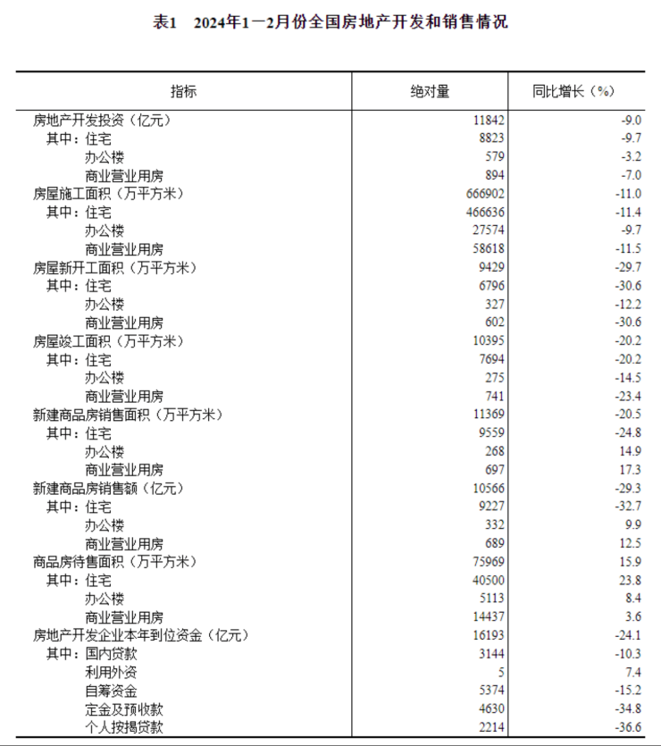 国家统计局发布2024年1—2月份全国房地产市场基本情况。数据显示,1—2月份,全国房地产开发投资11842亿元,同比下降9.0%(按可比口径计算);其中,住宅投资8823亿元,下降9.7%。