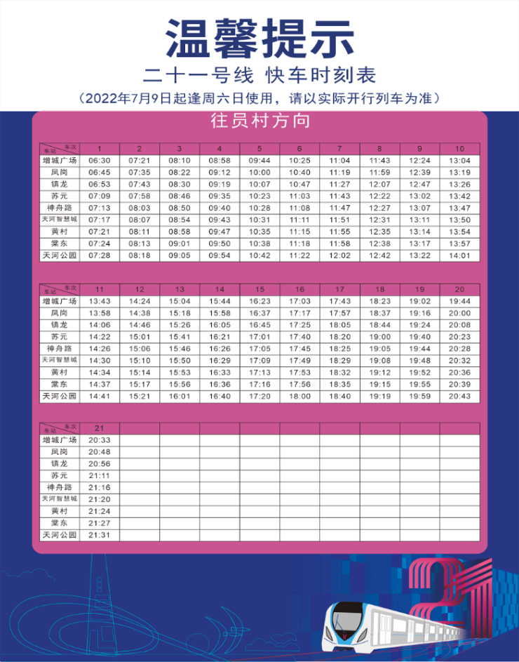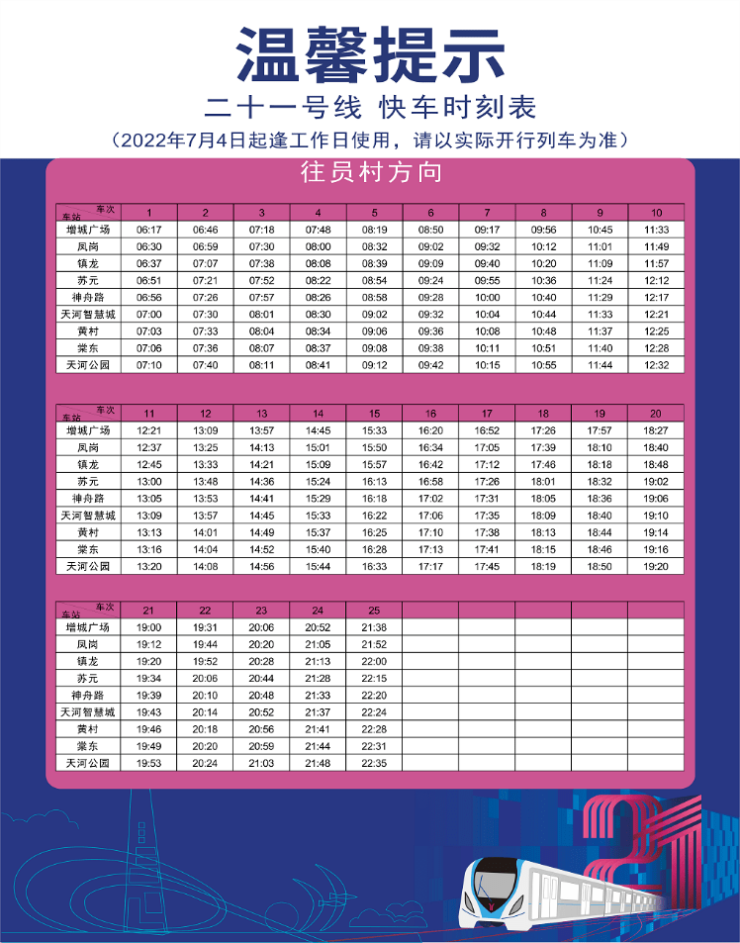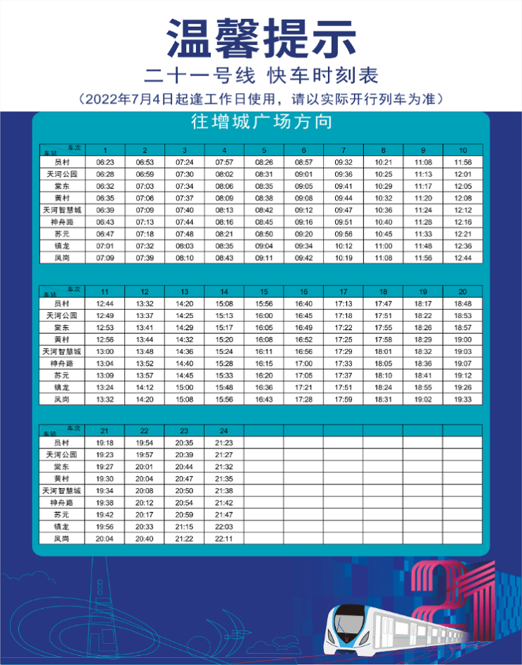 为满足客流变化需要,提高乘客服务质量,自7月4日起,二十一号线快车时刻表有所调整。调整后的快车时刻表分为7月4日起逢工作日使用,7月9日起逢周六日使用。图:林展锋图源:广州地铁图源:广州地铁图源:广州地铁快车…