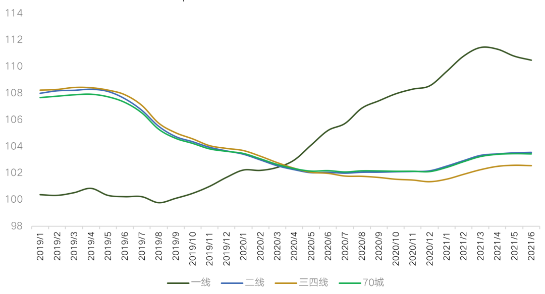 从全国商品房销售价格来看,2021年6月份,70个大中城市商品住宅销售价格涨幅整体呈现稳中有落的态势。