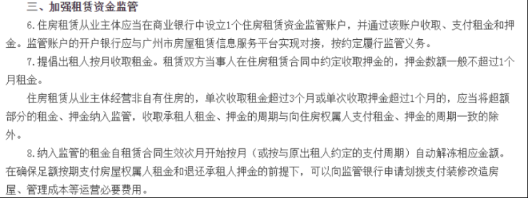 2022年4月,为进一步防范住房租赁市场风险,促进住房租赁市场健康发展,加快构建租购并举的住房制度,住建局发布《广州市住房和城乡建设局关于规范住房租赁市场的通知》。通知明确要求,住房租赁从业主体应当在商业银行中设立1个住房租赁资金监管账户,并通过该账户收取、支付租金和押金。监管账户的开户银行应与广州市房屋租赁信息服务平台实现对接,按约定履行监管义务。