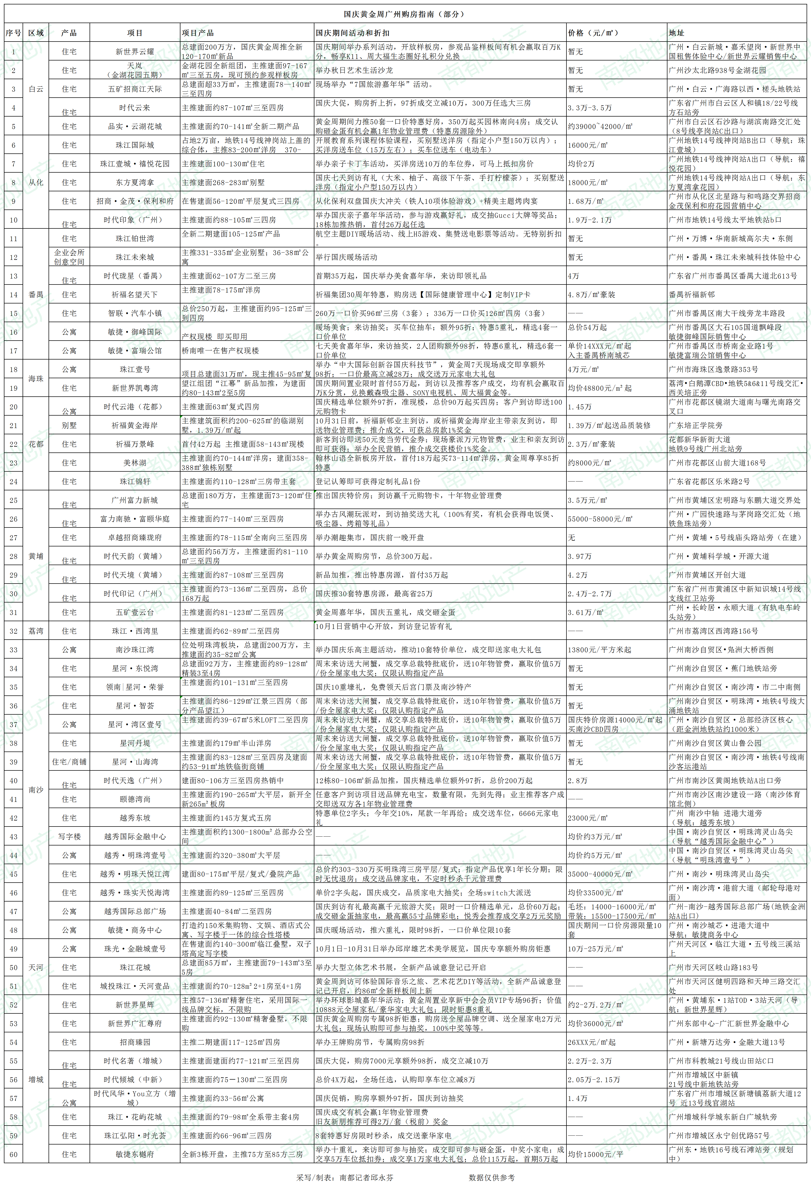 南都记者统计广州60个一手楼盘发现,不管是新盘还是旧盘,在这个国庆都开启优惠纳客模式,部分楼盘甚至愿意一年分期付款,绝大部分项目也启动全民营销。