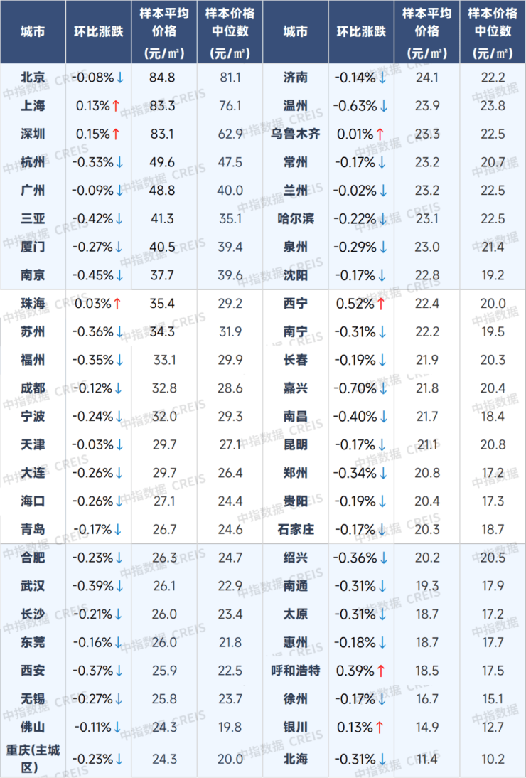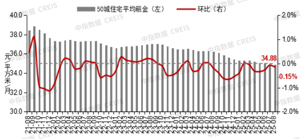 根据中国房地产指数系统百城价格指数对全国100个城市新建、二手住宅销售市场及50个城市租赁市场的调查数据:8月,百城新建住宅均价为16910元/平方米,在部分城市改善项目入市带动下,环比结构性上涨0.20%,同比上涨2.73%。二手房方面,“以价换量”现象延续,8月百城二手住宅均价为13481元/平方米,环比下跌0.76%,同比下跌7.34%。租赁住宅方面,毕业季效应逐渐消退,住房租赁需求释放节奏放缓,重点50城住宅平均租金环比跌幅略有扩大,8月50个城市住宅平均租金为34.88元/平方米/月,环比下跌0.15%,同比下跌3.76%。