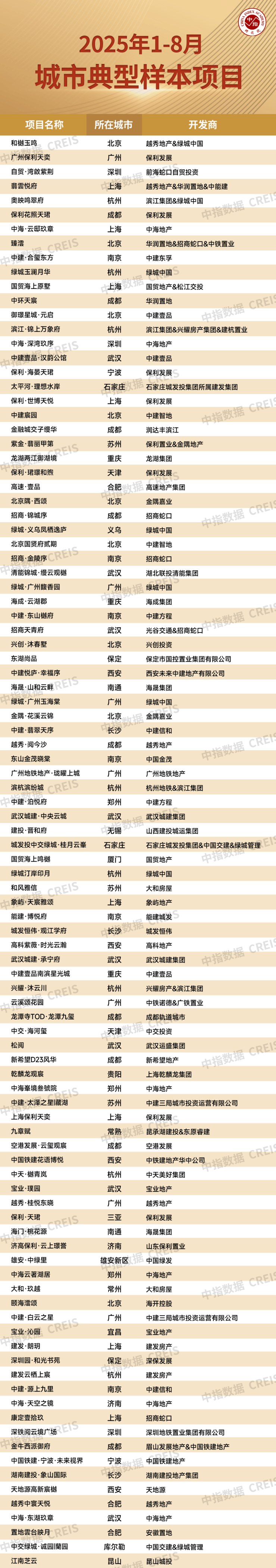 8月以来,多地继续出台“好房子”建设相关导则,如沈阳发布《沈阳市高品质住宅开发建设实施方案(2025-2027)》、福建省印发《福建省“好房子”设计技术指引(试行)》,推动“好房子”建设进程持续加速。与此同时,多加房企通过完善产品体系、加大媒体推广力度等方式不断强化自身品牌。中指研究院依托中房指数系统理论体系和架构,以“典型性”为基本原则,从百城价格指数样本项目中选取城市中有较强知名度和广泛影响力的典型样本项目,围绕销售表现、项目品质、品牌实力等维度出发,对主要城市样本项目进行研究,得出“2025年1-8月城市典型样本项目”,为行业提供标杆典范。