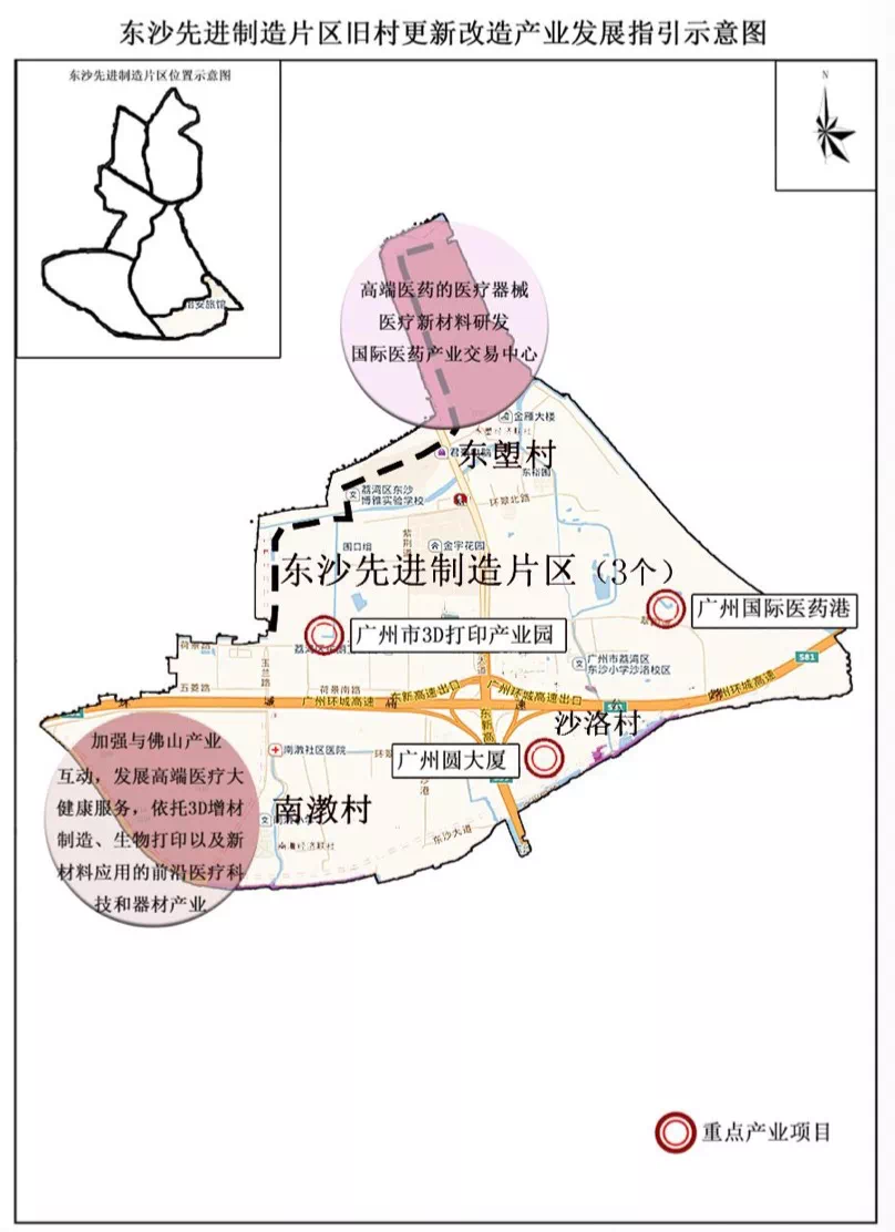 片区有南漖、东塱和沙洛三条城中村进行更新改造,可以统筹联动开发,构建东沙片区高端医疗服务业、医疗产业带和智能制造业。以广州国际医药港为引领,可集聚高端服务业总部、先进制造业总部。