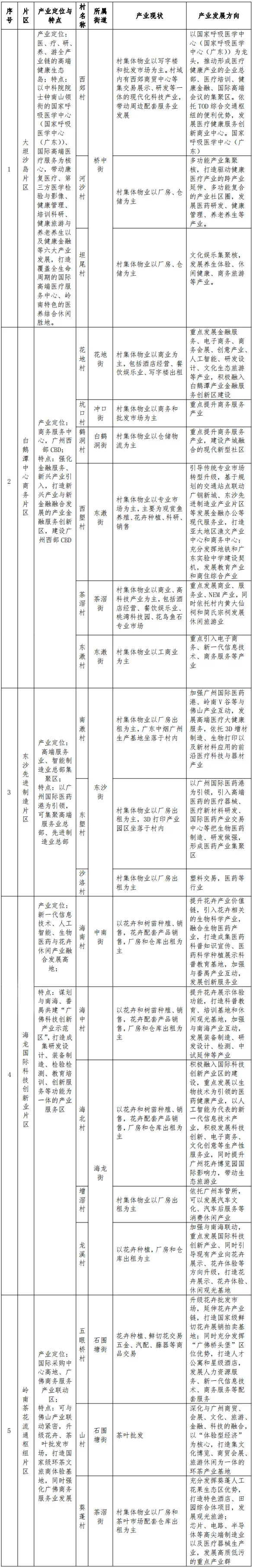 规划改造分为五大片区:大坦沙岛片区、白鹅潭中 心商务片区(包括西塱综合交通枢纽组团)、东沙先进制造片区、 海龙国际科技创新产业片区、岭南茶花流通枢纽片区。各个片区内的城中村改造应充分结合本地区产业基础特色、重大项目开发建设和新兴产业升级等机遇,实行差异化发展的改造思路。