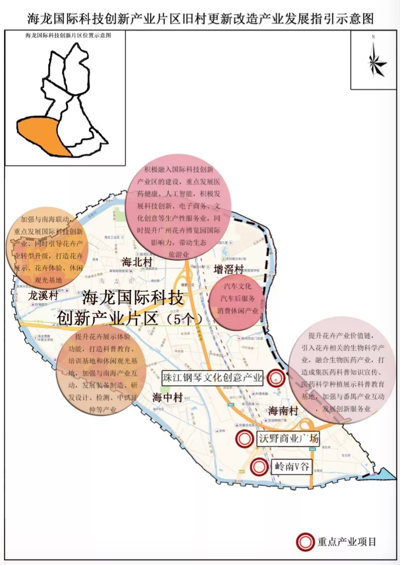 应积极融入国际科技创新产业区的建设,引入科技研发产业, 发挥与佛山的科创产业形成协同联动作用,提升产业规模与效益, 全面推进海南、海中、海北、增滘、龙溪5条城中村的改造。谋划与南海、番禺共建“广佛科技创新产业示范 区”,打造成集研发设计、装备制造、检验检测、教育培训、创新服务等功能为一体的产业服务区。