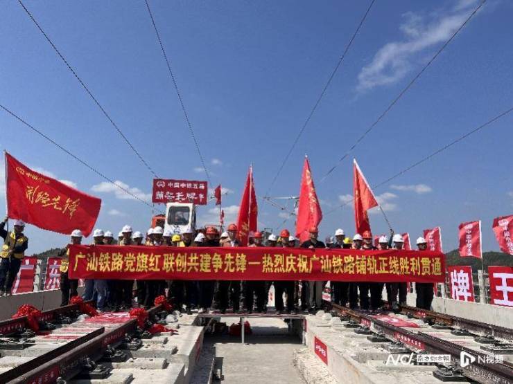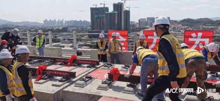 近日,在广东省汕尾市广汕高铁东冲特大桥铺轨施工现场,随着施工人员操纵着铺轨机组将最后一组500米长钢轨安全平稳铺设到位,标志着广汕高铁全线正线轨道铺设圆满完成,为全线按期联调联试奠定了坚实基础。