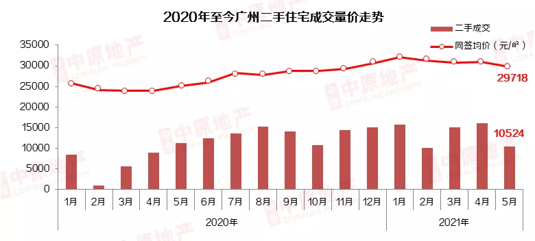 2021年5月,广州市二手住宅成交量(自助网签+中介网签)为10524宗,环比4月同期(16025宗)环比下降34.33%。