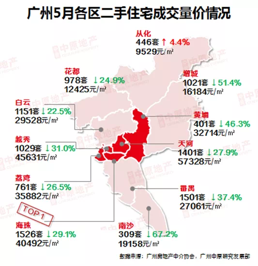 其中,增城、南沙、黄埔三区跌幅明显,本月分别成交1021宗、309宗、401宗,环比分别下降51.4%、67.2%、46.3%。