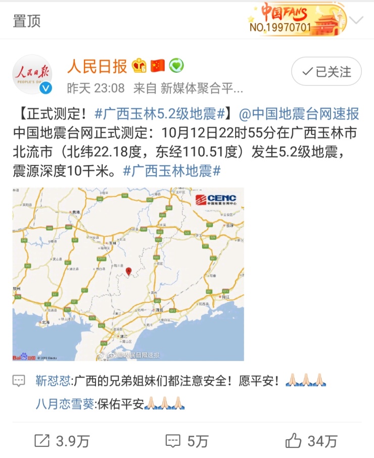 由于地震在珠三角地区比较罕见,果然很快在热搜上刷到官方的声明。地震波来自广西玉林,离广州300多公里,以至于广州和广东西部部分地区均有震感。