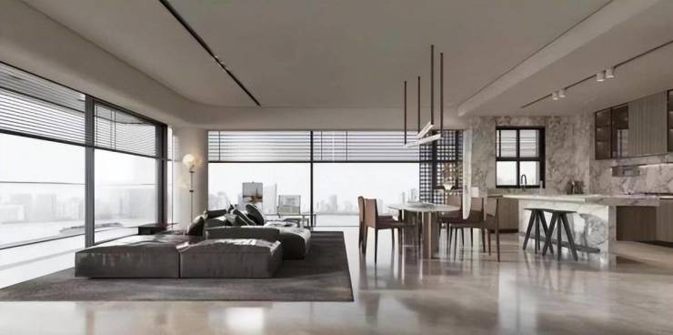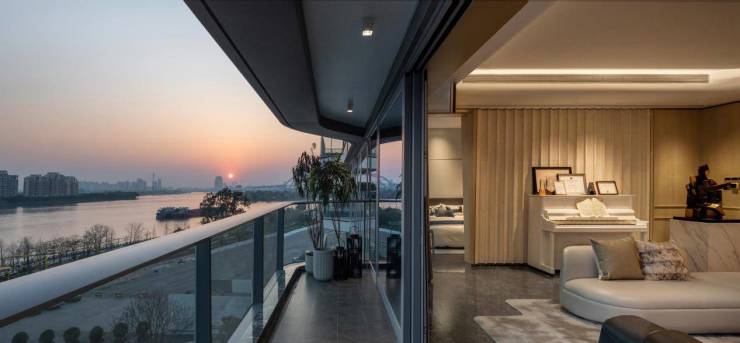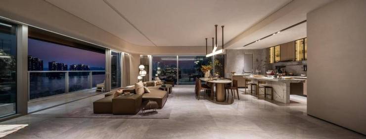 其中,餐客厅更是打造成一个“迷你观景舱”,270°面江无界视野。约9.5米+约7.1米的转角客餐厅,长达16米多的江景面,实现了室内与城市、自然的无缝对接,保证了室内的采光度,并且可以享受一览无余的视野。