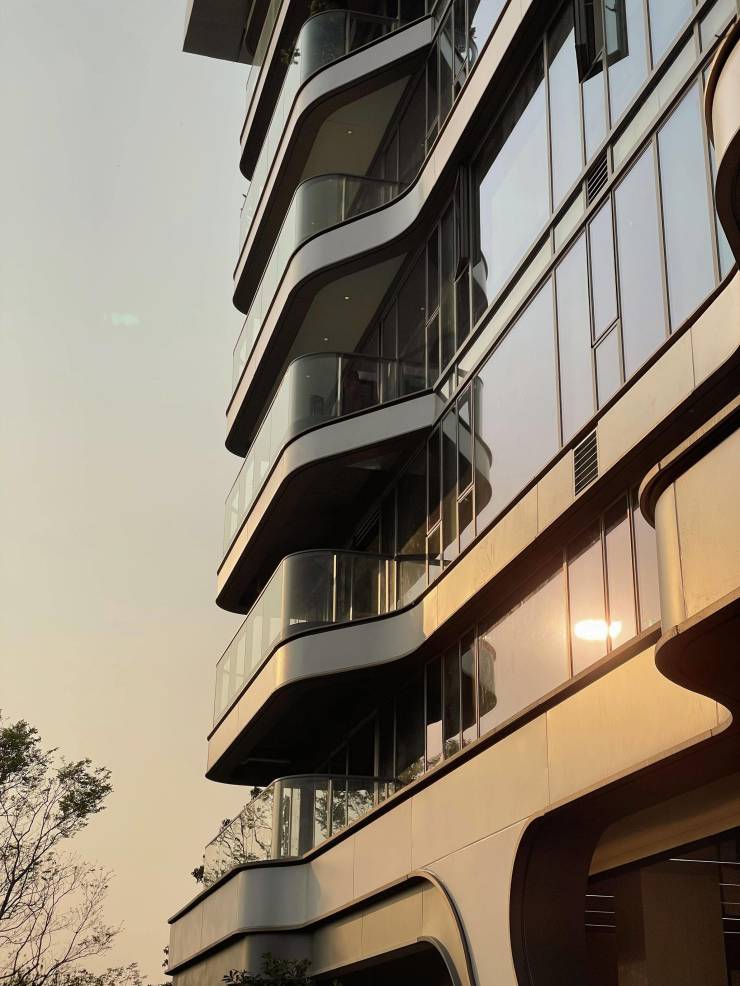天越组团,外立面采用全玻璃幕墙+退台式设计,白天远眺,玻璃立面仿若水波于天际间流淌,犹如波浪镜面一般,动态泛映一线江景。