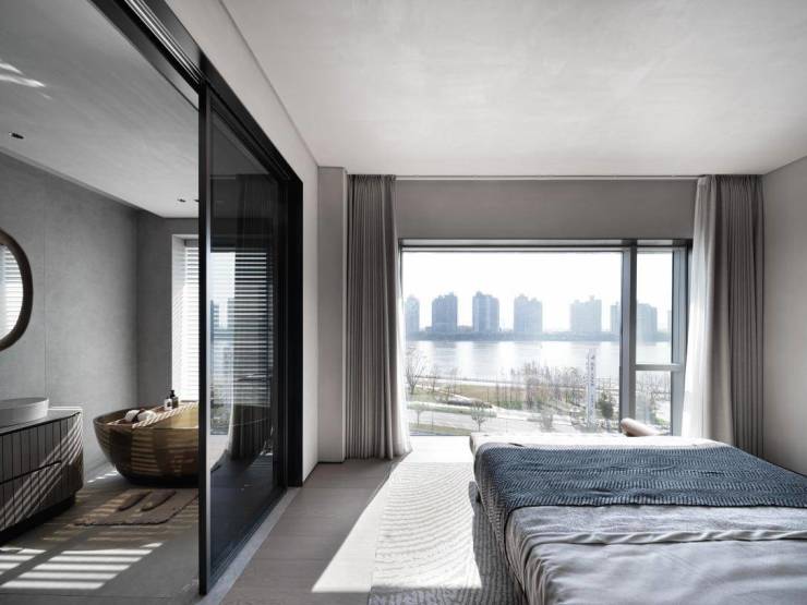 更令人艳羡的,是天越组团的主卧就像一个巨幕观江屏,用一句话形容就是:“除非你闭上眼才能看不到江景。”