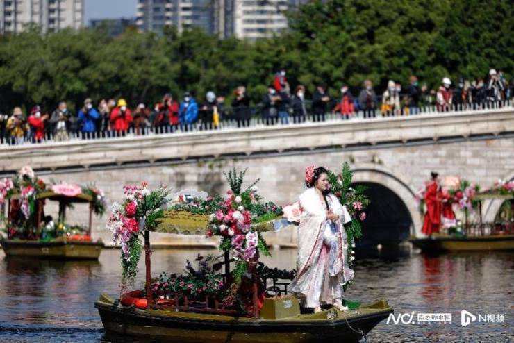 荔湾湖面上,网络主播身穿汉服坐在花舫巡游,参与“水上花市销售王者”擂台赛,为岭南鲜花带货;岸边,花舫不时停靠,市民赏花、选购,享受多元化的花市游玩体验。荔湾湖公园内年俗摊位街也是年味十足,沿线还有手作表演、街头文艺快闪等。