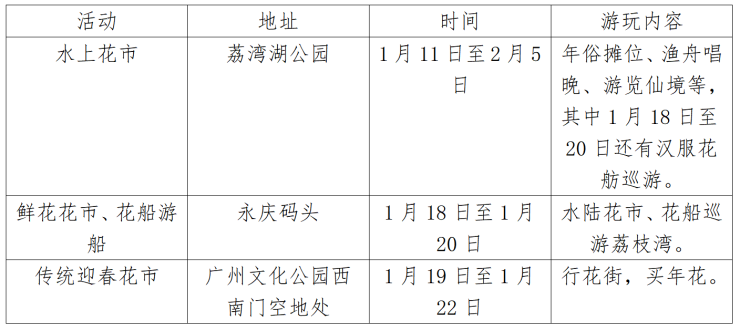 今年,天河区迎春花市围绕赏花购花、购买年货、文化展示开展。天河体育中心将打造迎春赏花、年货采购及非遗展示点,各街道围绕“一街道一品牌”打造“1+N”主题花市,方便群众就近赏花、购花。此外天河区还将举办系列配套文化活动,如举办新春户外音乐会、展览、诗词大会等,营造浓厚节日氛围。