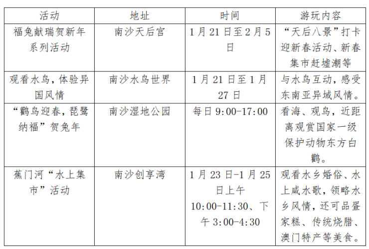 春节期间,南沙区推出“看海、观鸟、品南沙味”系列活动。南沙湿地景区结合候鸟中的珍惜鸟种——东方白鹳和黑脸琵鹭开展看海、观鸟、品南沙系列活动。游客可乘坐游船深入红树林,近距离观赏国家一级保护动物东方白鹳。在蕉门河“水上集市”,市民可以登岭南特色柚木古帆船,欣赏香云纱,观看水乡婚俗、水上咸水歌,领略水乡风情,还可品疍家糕、传统烧腊、澳门特产等美食,小朋友们也可以参与皮划艇展示和教学活动。