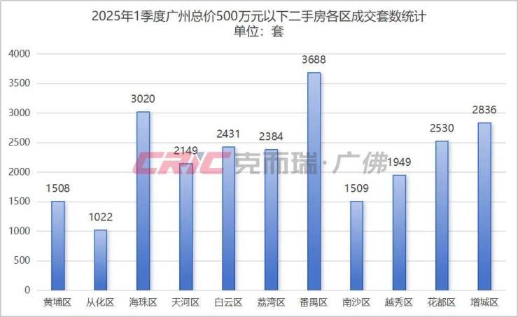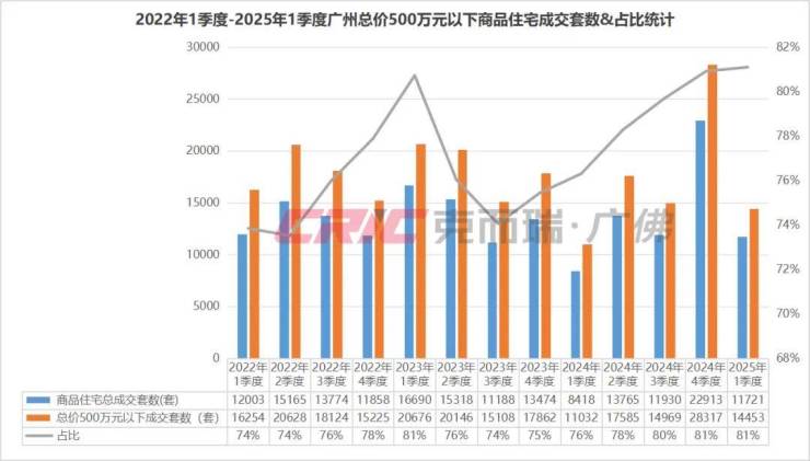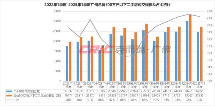 克而瑞数据监测显示,2025年一季度广州总价500万元以下二手房共成交24851套,占比达到了91%。