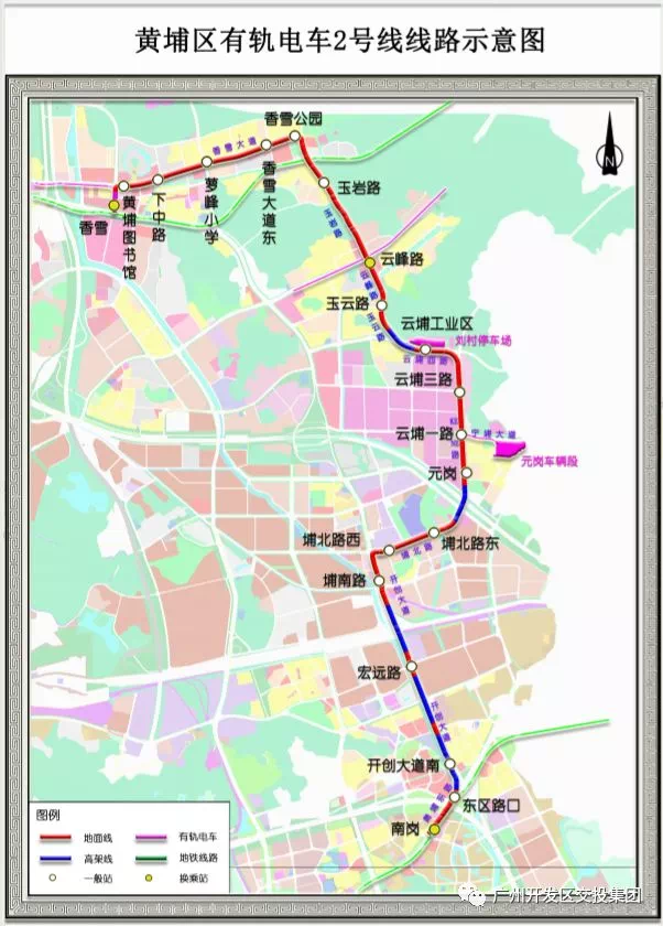 黄埔有轨电车2号线是黄埔区“一主三支”有轨电车骨干线网的重要组成部分,分两期建设,一期为香雪站至南岗站,二期为香雪站至长岭居岭头。