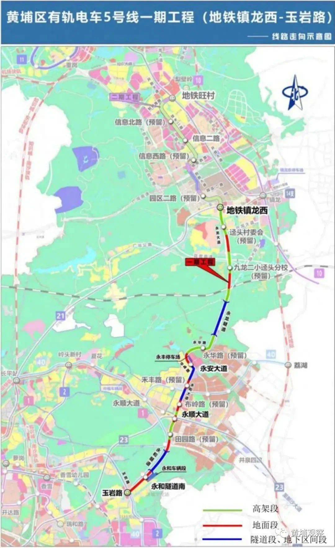 黄埔区有轨 5 号线一期(地铁镇龙西~玉岩路),项目总投资约 30 亿元。起于地铁镇龙西站,止于玉岩路站,线路长 14.41公里,其中:地面线 4.445公里、地下线 4.415公里、高架线 5.5公里。一期共设车站 5 座。