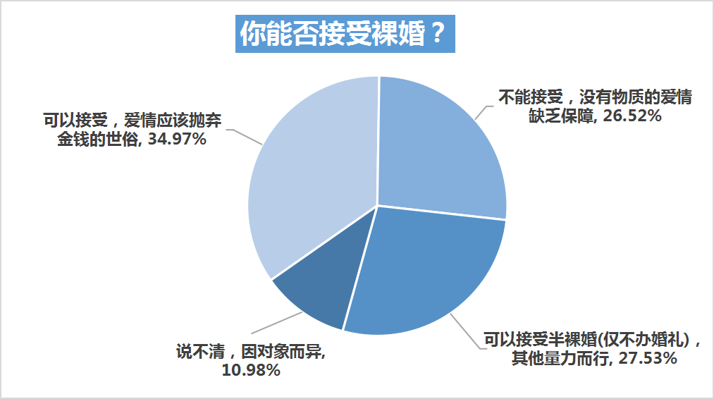调查中,对于不办婚礼、无需房子、没有彩礼的“裸婚”形式,34.97%的未婚受访者表示可以接受裸婚(不买房、不买车、不买钻戒、不办婚礼、不度蜜月,直接登记结婚的形式);27.53%表示可以接受半裸婚(仅不办婚礼),其他量力而行;26.52%表示不接受裸婚,认为没有物质的爱情缺乏保障;其余受访者则表示因对象而异。