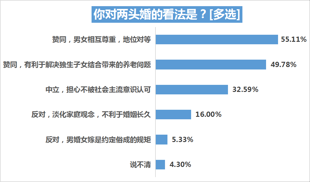 而随着独生子女步入婚龄,近年来江浙一带悄然兴起一种新的婚姻形式——两头婚。既不是男娶女嫁,也不属于招男入赘,小夫妻彼此对等、双方父母家两头走,且通常会生育两个小孩,分别随父母姓。调查中,超六成的未婚受访者表示对两头婚有所了解,其中三成半受访者表示身边也有这样的例子。提及对两头婚的看法,超半数未婚受访者表示赞同,55.11%的受访者认为体现了男女相互尊重、地位对等,49.78%的受访者认为有利于解决独生子女结合带来的养老问题。也有32.59%的受访者对两头婚持中立态度,担心不被社会主流意识认可;此外,一成半受访者觉得两头婚淡化家庭观念,不利于婚姻长久,以及不符合约定俗成的男婚女嫁规矩。
