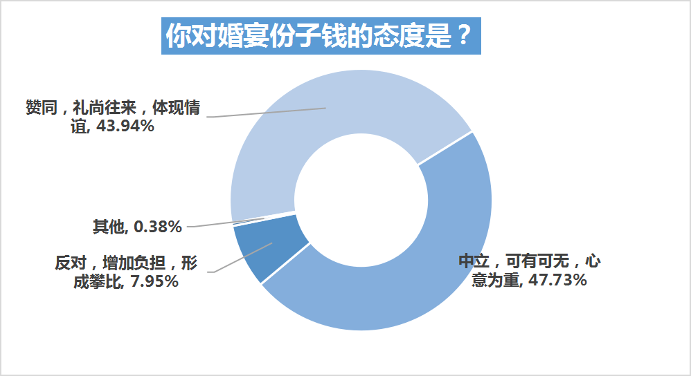 参加婚礼时免不了讨论婚宴份子钱。调查中,超九成未婚受访者表示当地参加婚礼需要随份子钱,55.18%的受访者表示份子钱不会返还,37.12%的受访者表示份子钱会在婚礼后会返还,另有少数受访者表示不需要随份子钱。对于婚宴份子钱,47.73%的未婚受访者持中立立场,认为“可有可无,心意为重”,43.94%的人表示赞同,认为“礼尚往来,体现情谊”,仅7.95%的人持反对态度,认为“增加负担,形成攀比”。