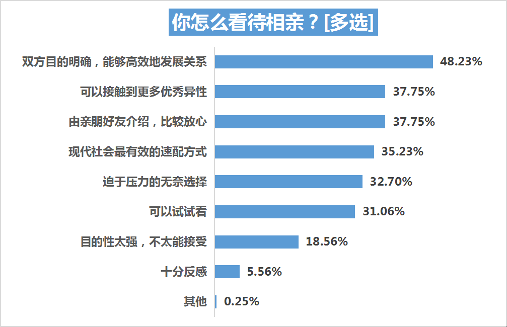 说起对相亲的看法,48.23%的受访者认为“双方目的明确,能够高效地发展关系”;37.75%认为“可以接触到更多优秀异性”“由亲朋好友介绍比较放心”;35.23%认为是“现代社会最有效的速配方式”占比。也有32.7%的受访者认为相亲是“迫于压力的无奈选择”;18.56%认为“目的性太强,不太能接受”;6%表示十分反感。