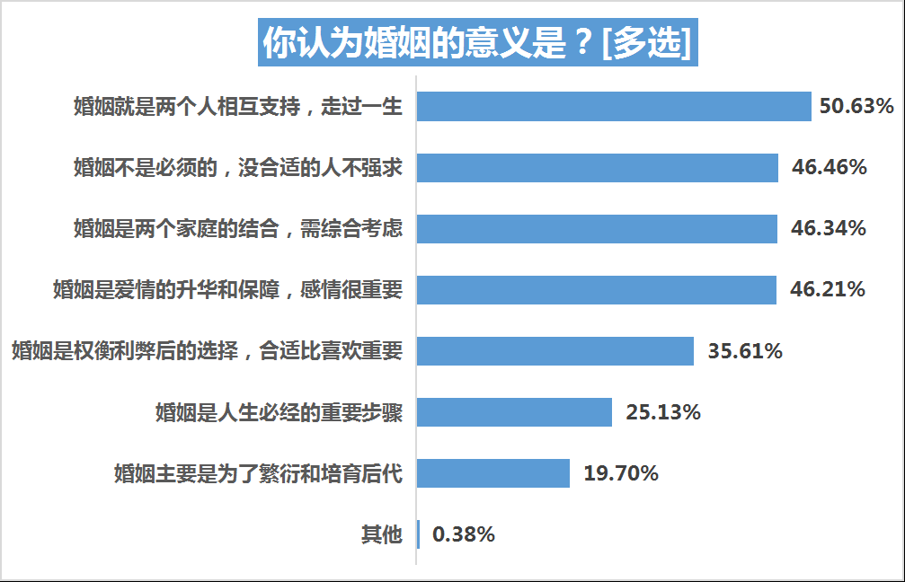 说起婚姻的意义,无论男女同样认可“婚姻是爱情的升华和保障,感情很重要”,比例超过45%。未婚男性受访者认为“婚姻是权衡利弊后的选择,合适比喜欢重要”“婚姻是人生必经的重要步骤”“婚姻主要是为了繁衍和培育后代”的比例更高,均比女性高出超过10%。而未婚女性受访者认为“婚姻不是必须的,没合适的人不强求”的比例更高,较男性高出24.85%。