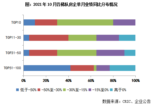 企业层面,10月TOP100房企单月业绩规模较9月环比回升1.4%,单月业绩同比去年同期延续了自7月以来的下跌趋势,但降幅收窄至32.2%。逾8成百强房企单月业绩同比降低,其中44家房企业同比降幅大于30%,同环比双降的百强房企数量达37家。10月房企单月业绩表现不及上半年及历史同期。