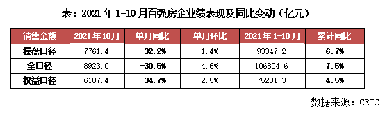 2021年10月,TOP100房企实现销售操盘金额7761.4亿元,单月业绩规模较9月环比回升1.4%。受下半年市场明显降温的影响,10月单月业绩同比去年同期延续了自7月以来的下跌趋势,但降幅略有收窄至32.2%。累计业绩来看,1-10月百强房企实现销售操盘金额93347.2亿元,较2019年和去年同期分别增长18.5%和6.7%,累计业绩增速放缓。