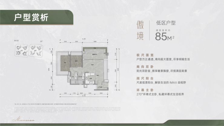 另一个热门户型85平,光是景观阳台就超过14平,足足约5.9米长,主卧设置了U字型大飘窗,空间尺度直追110平。