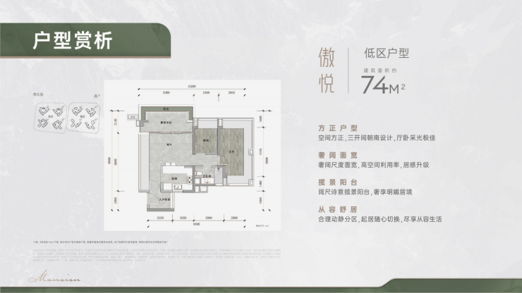 比如门槛最低的74平户型,设计了约5.2米双面宽阳台,主卧还有270°观景飘窗,做到南北对流、全明采光。