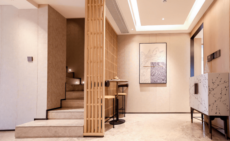 从尊梯入户归家,进门后就是一个非常有仪式感的空间,既能作为缓冲区,还可用于收纳。