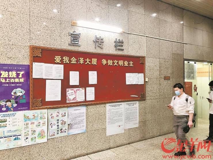 小区宣传栏上张贴着天河南街道办事处《关于选聘金泽大厦物业服务企业事宜的函》