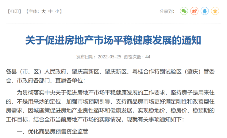 肇庆6部门联合印发《关于促进房地产市场平稳健康发展的通知》,提出优化商品房预售资金监管、加大金融支持以及提高首套住房公积金贷款上限等举措。