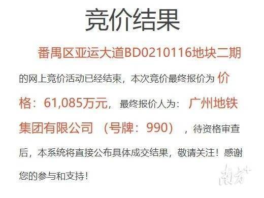 3月31日上午,亚运大道BD0210116地块二期(即广州新城停车场二期地块)被广州地铁以底价61085万元拿下,折合楼面价11000元/㎡,若扣除配建实际楼面价约1.19万/㎡。
